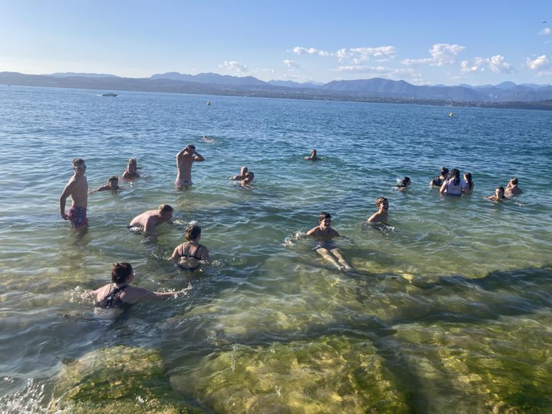 Nach einer 11stündigen Nachtfahrt und einer größeren Pause direkt am Gardasee in Malcesine, kamen wir am Montag gegen Mittag endlich in unserer Unterkunft im Garda Village an. Kaum hatten wir eingecheckt, ging das Programm auch schon los. Nachmittags liefen wir zu Fuß nach Sirmione, wo wir zuerst eine Bootstour um die Halbinsel und dann einen Stopp am Jamaica Beach zum Baden machten. Am Abend saßen wir dann gemütlich zusammen und ließen den ersten Tag ruhig ausklingen.