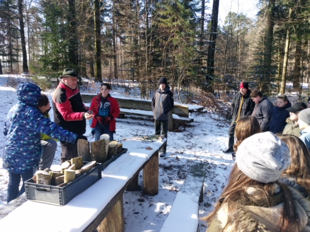 Am 20. und 21.März 2018 trafen wir uns morgens in unseren jeweiligen NuT-Gruppen, um mit unseren Lehrern Frau Lang, Herr Bodenmüller und Herr Gessner von der Schule zu den Wellingtonien zu laufen. Dort angekommen warteten wir auf den Förster Herr Ulrich, der uns unterschiedliche Baumarten erklärte. Danach waren wir an der Reihe verschiedene Früchte, Blätter und Holz des Waldes zu suchen. Diese sollten wir zu einem Sammelplatz bringen, um dann anschließend gemeinsam zu schauen, was wir für Arten gesammelt hatten.