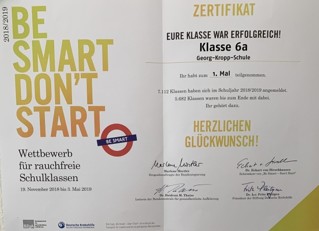 Für die Klasse 6a unserer Schule hat sich der Verzicht aufs Rauchen jetzt ausgezahlt: Sie gehören zu den Gewinnern des diesjährigen Nichtraucherwettbewerbs „Be smart – don`t start“ und wurden für die regionale Preisverlosung ausgelost.