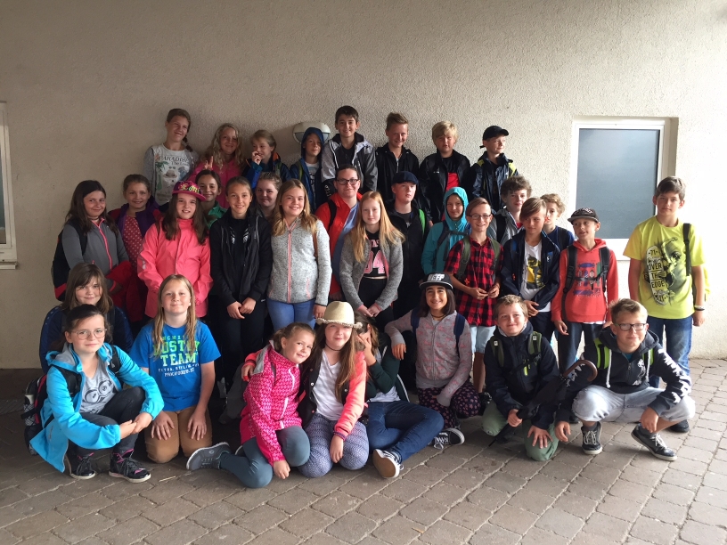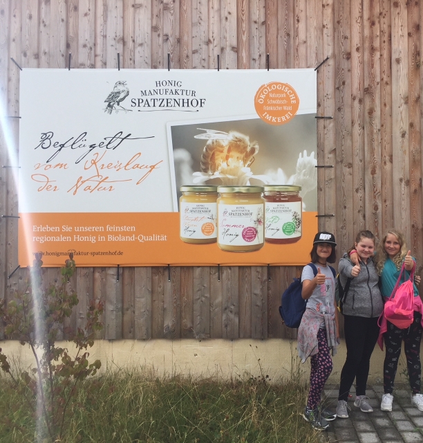 Im Biologieunterricht der Klasse 5 haben wir uns mit der Honigbiene beschäftigt. Leider haben wir ja keine Bienen in der Schule und deswegen besuchten wir am 16.7.2018 Markus Schwarz, den Imker im Spatzenhof. Herr Schwarz begrüßte uns in seiner Honigmanufaktur und führte uns in seine große Halle, in der er die Bienenkästen, Honiggläser und weitere Arbeitsgeräte lagert. Er klärte uns über das Bienenvolk auf. Ein Volk umfasst zur Hochsaison im Frühsommer bis zu 50.000 Bienen und besteht aus einer Königin, Arbeiterinnen (weibliche Bienen) und Drohnen (männliche Bienen). Während die Arbeiterinnen fleißig putzen, Wache halten und sammeln, besteht die einzige Lebensaufgabe der Drohnen darin, eine Königin zu befruchten.