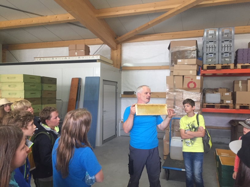 Jetzt im Sommer ist die Hauptarbeitszeit von Herr Schwarz. Er ist jeden Tag unterwegs zu seinen Bienenstöcken, die im Umkreis von 20 km um Wüstenrot, aber auch bis in die Pfalz verteilt sind, um sich um die Bienen und ihre Stöcke zu kümmern und den Honig zu ernten. Er legt Wert auf natürliche Holzbeuten sowie den Naturwabenbau seiner Bienen. Auch schleudert er den Honig nur aus unbebrüteten Waben und benutzt keine synthetischen Bekämpfungsmitteln gegen die Varroamilbe. Nach den vielen Informationen hat er uns seinen Arbeitsraum gezeigt, in dem er eine Schleudermaschine hat, um den Honig aus den Waben zu gewinnen. In seiner Schatzkammer neben dem Arbeitsraum lagert Herr Schwarz die verschiedenen Honigsorten. Zum Abschluss durften wir einen Waldhonig und eine Streuobstwiesenhonig verkosten.