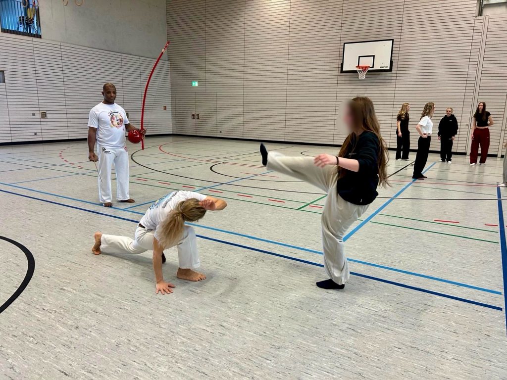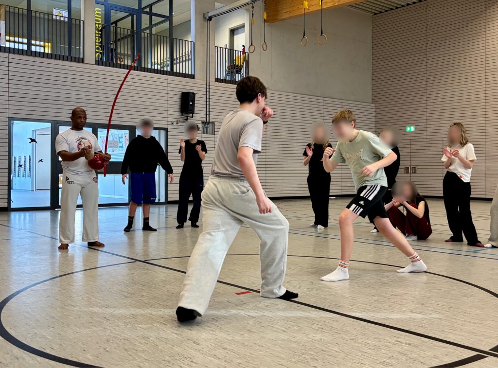 Am 26.02.26 durften unsere SchülerInnen der Klassen 9 und die Mädchen der Klasse 7 ein ganz besonderes Erlebnis genießen: Einen Capoeira-Workshop der Abadá Capoeira-Schule Stuttgart. Die beiden Dozenten Manu und Estácio besuchten unsere Schule und führten die Kinder in die faszinierende Welt der brasilianischen Kampfkunst ein.