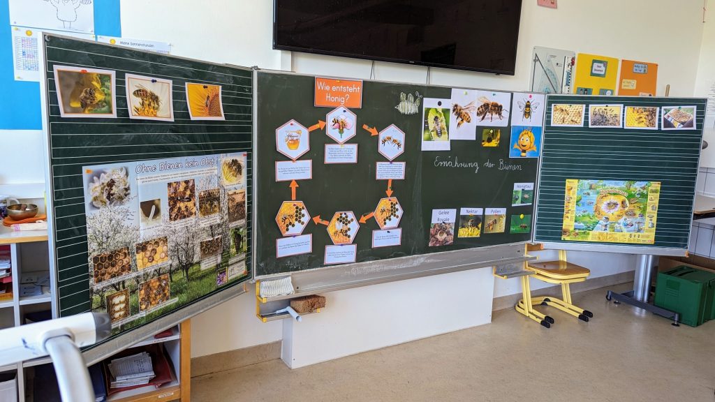 Die Zweitklässler erkundeten die Welt der Honigbiene. Sie lernten die Struktur eines Bienenvolkes kennen, begleiteten eine Bienen-Arbeiterin auf ihrem Lebensweg und erfuhren einiges über die Bedeutung der Honigbiene für uns Menschen. Außerdem lernten sie andere geflügelte und gestreifte Insekten von der Honigbiene zu unterscheiden. Das Highlight dieser Einheit bildete der Lerngang zum Imker der Honigmanufaktur Spatzenhof. Hier erlebten die Kinder, dass man keine Angst vor Bienen haben muss. Denn wenn man sich an die Regeln hält, wird man auch nicht gestochen. Am Naturparkfest vermittelten die Kinder den Besuchern ihr erworbenes Wissen durch verschiedene interaktive Angebote.