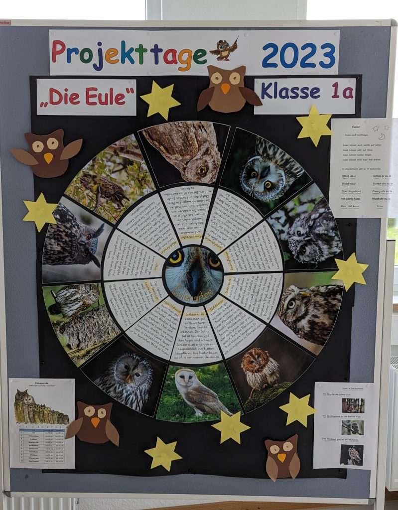 Die Erstklässler befassten sich mit dem Thema Greifvögel und Eulen. In Klasse 1a lag der Schwerpunkt auf dem Thema Eulen. Die Kinder sammelten Informationen dazu in Filmen und kleinen Texten aus einem Eulenbuch. Sie festigten ihr Wissen beim Legen eines großen Lesekreises und jedes Kind gestaltete sein eigenes Eulenheft. Ein Bastelangebot rundete das Thema ab. Besonders toll fanden die Kinder den Besuch in der Greifvogelanlage am Spatzenwald am zweiten Projekttag. Die Kinder durften sich in der Anlage umschauen und erlebten eine beeindruckende Flugvorführung. Die Klasse 1b beschäftigte sich mit den tagaktiven Greifvögeln.