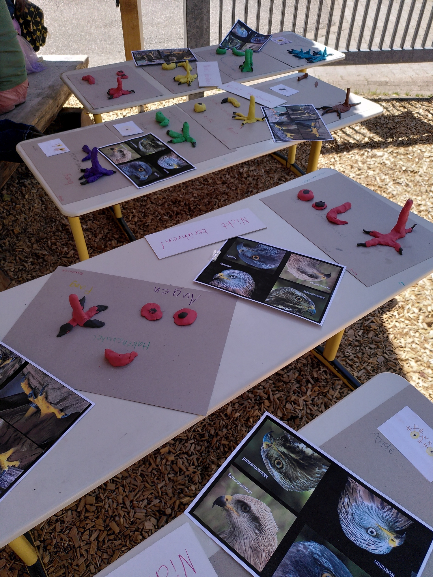 Die Erstklässler befassten sich mit dem Thema Greifvögel und Eulen. In Klasse 1a lag der Schwerpunkt auf dem Thema Eulen. Die Kinder sammelten Informationen dazu in Filmen und kleinen Texten aus einem Eulenbuch. Sie festigten ihr Wissen beim Legen eines großen Lesekreises und jedes Kind gestaltete sein eigenes Eulenheft. Ein Bastelangebot rundete das Thema ab. Besonders toll fanden die Kinder den Besuch in der Greifvogelanlage am Spatzenwald am zweiten Projekttag. Die Kinder durften sich in der Anlage umschauen und erlebten eine beeindruckende Flugvorführung. Die Klasse 1b beschäftigte sich mit den tagaktiven Greifvögeln.