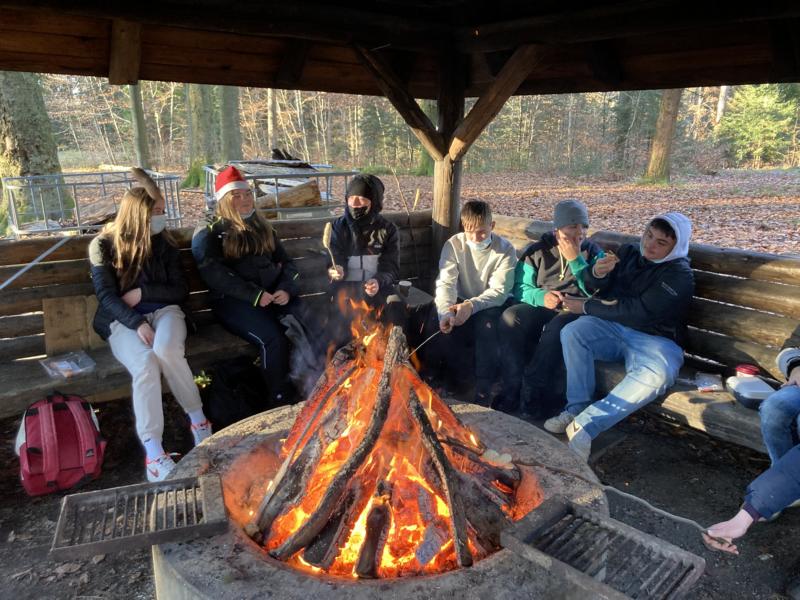 Als um 11:00 Uhr die Eismaschine auf‘s Eis fuhr, mussten wir leider schon gehen. Zurück an der Schule hatten wir Mittagspause und sind anschießend zu den Wellingtonien gelaufen. Dort haben wir am Feuer Würstchen gegrillt, Stockbrot gemacht und Punsch getrunken, den Frau Holderbach und Frau Kappe uns spendiert haben. Das war ein schöner Abschluss von unserem ereignisreichen Jahr 2021. 😊