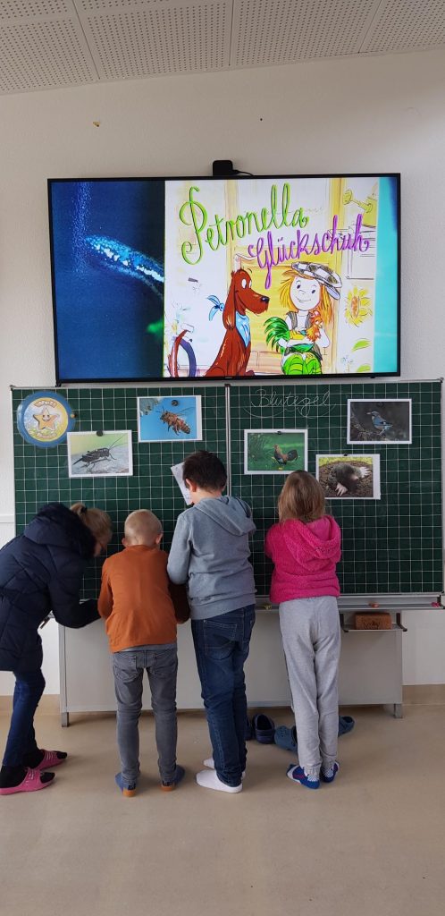 Klasse 3 startete mit der Lektüre ihrer Ganzschrift „Petronella Glücksschuh“ von Dorothea Flechsig. Mit Hilfe des eines Lesetagebuches erschlossen sich die Kinder den Text. Geleitet wurden sie dabei von den lebhaften Illustrationen. Diese halfen ihnen dabei, in die kreative Textproduktion einzusteigen. Außerdem wurden die Inhalte des Buches weiter vertieft. Die Kinder lernten viele interessante Dinge über ein besonderes Tier, das in der Lektüre eine zentrale Rolle spielt. Mit dem Blutegel stand hier ein für Kinderbücher eher untypisches Tier im Mittelpunkt. Außerdem besuchten die SchülerInnen die Gemeindebücherei. Dort konnten sich die Kinder als Ausleiher registrieren, um in Zukunft selbstständig auf die Suche nach neuem Lesestoff zu gehen. Zum Abschluss gab es noch, ganz wie in der Lektüre, leckeren Holundertee.