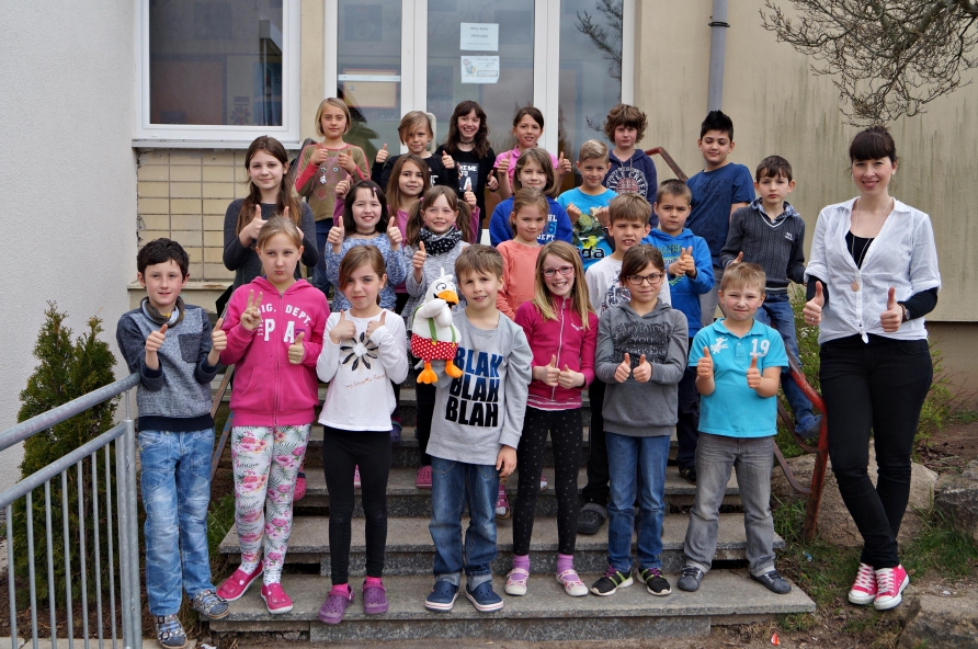 Im März lud der Verlag an der Este alle Schulen in ganz Deutschland dazu ein, an ihrem Jubiläumsgewinnspiel, zu Ehren des 30. Geburtstages, teilzunehmen. Gesucht wurden phantasievolle Geschichtenschreiber und ideenreiche Köpfe, die ein spannendes Abenteuer von „Gänsefüßchen“, dem Maskottchen des Verlages, zu Papier bringen wollten. „Da machen wir mit!“, war sofort der Tenor der dritten Klassen der Georg-Kropp-Schule in Wüstenrot. Voller Feuereifer machten sich die Kinder ans Werk. Es wurden Geschichtenkonferenzen einberufen, die Leseecke zur Besprechungsecke der Ideen umfunktioniert und gemeinsam oder alleine an den Geschichten getüftelt und gewerkelt. Manche der jungen Autoren illustrierten die Geschichte sogar noch mit passenden Bildern und machten sich viel Mühe und Arbeit. „Hoffentlich gewinnen wir!“, hörte man immer wieder im Klassenzimmer. Mit dieser Hoffnung wurden die Geschichten eingesendet und ab diesem Zeitpunkt die Rückantwort mit Ungeduld erwartet. „Wann kommt endlich was vom Gänsefüßchen?“, konnte längere Zeit nur mit einem Achselzucken beantwortet werden, bis eines Tages ein Paket eintrudelte. Die Spannung der Kinder war riesig und die Freude unglaublich, als verkündet werden konnte, dass die Klasse 3a die Jury mit ihren Geschichten überzeugen konnte und unter den 50 besten Einsendungen einen Platz erhielt. „Juhu, wir haben gewonnen!“, jubelte es aus allen Richtungen. Der Lohn für ihre tollen Geschichten war eine große, kuschelige Handpuppe vom Gänsefüßchen, die sich seit diesem Tag das Maskottchen der Klasse 3a nennen darf. Auch die Klasse 3b wurde für ihre tollen Geschichten entlohnt und die Kinder erhielten eine Urkunde und ein Schreibimännchen, welches ihnen beim Schreiben ihrer nächsten Geschichte helfen soll. Gänsefüßchen ist von nun an überall dabei und aus den Händen der Kinder nicht mehr wegzudenken. So durften die Kinder die spannenden Abenteuer von Gänsefüßchen nicht nur in ihren Köpfen erleben sondern ab jetzt auch live im Klassenzimmer.
