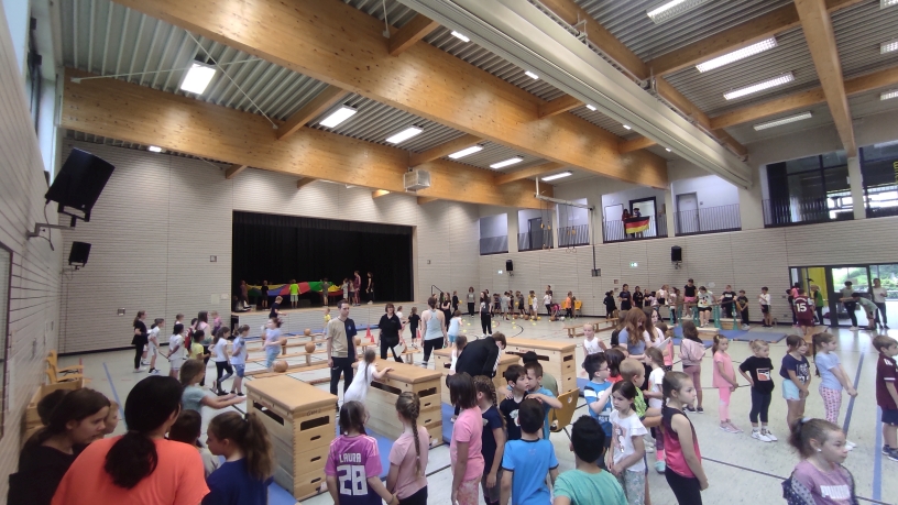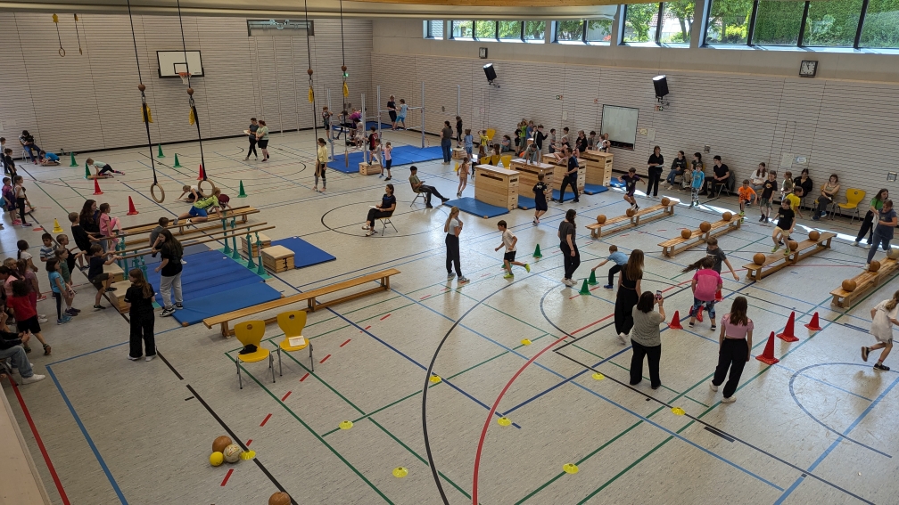 Nach einem herzlichen Grußwort von Frau Bayer und einem schwungvollen Aufwärmtanz mit Frau Kraus stürzten sich die SchülerInnen voller Begeisterung auf die sieben Stationen und sammelten gemeinsam Punkte für ihre Klassen. Mit großem Eifer meisterten sie die verschiedenen Herausforderungen wie das Überqueren von Barren im Spinnengang, das Klettern an Reckstangen, das Überwinden von Kästen, das Jonglieren mit Bällen, das Steuern von Rollbrettern, das Balancieren über Langbänke und das gemeinschaftliche Manövrieren eines Schwungtuchs.