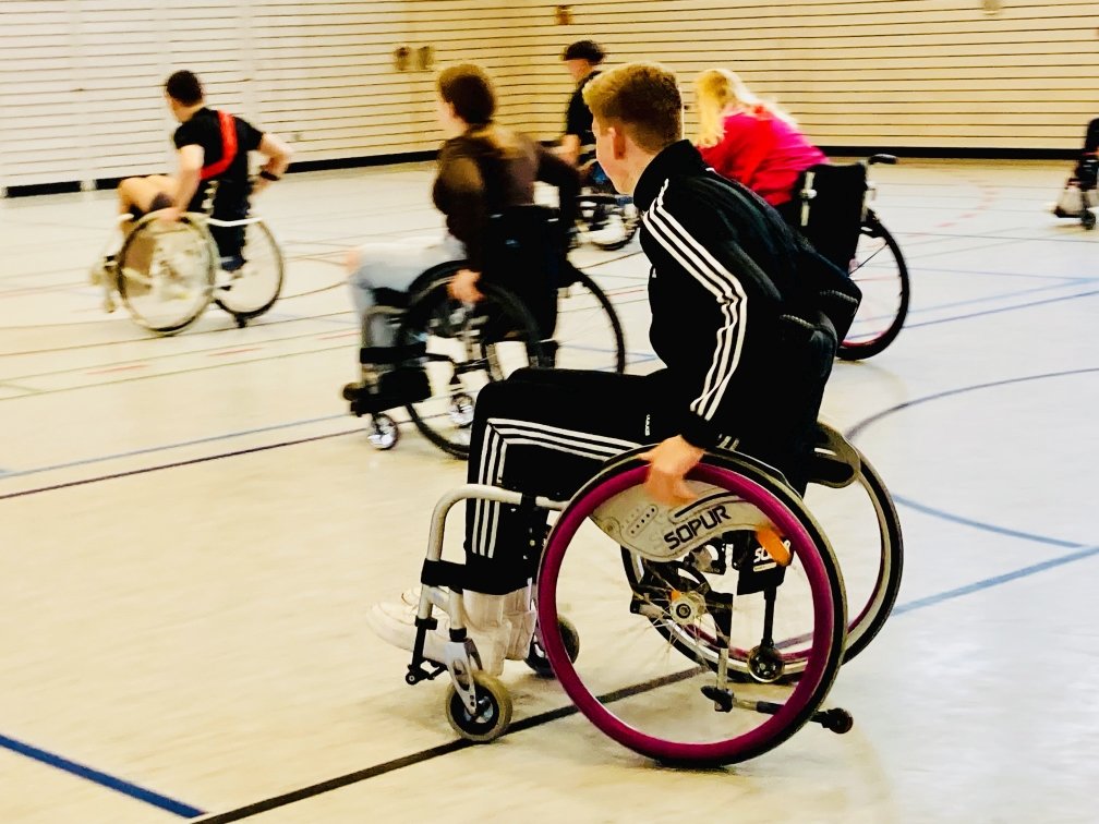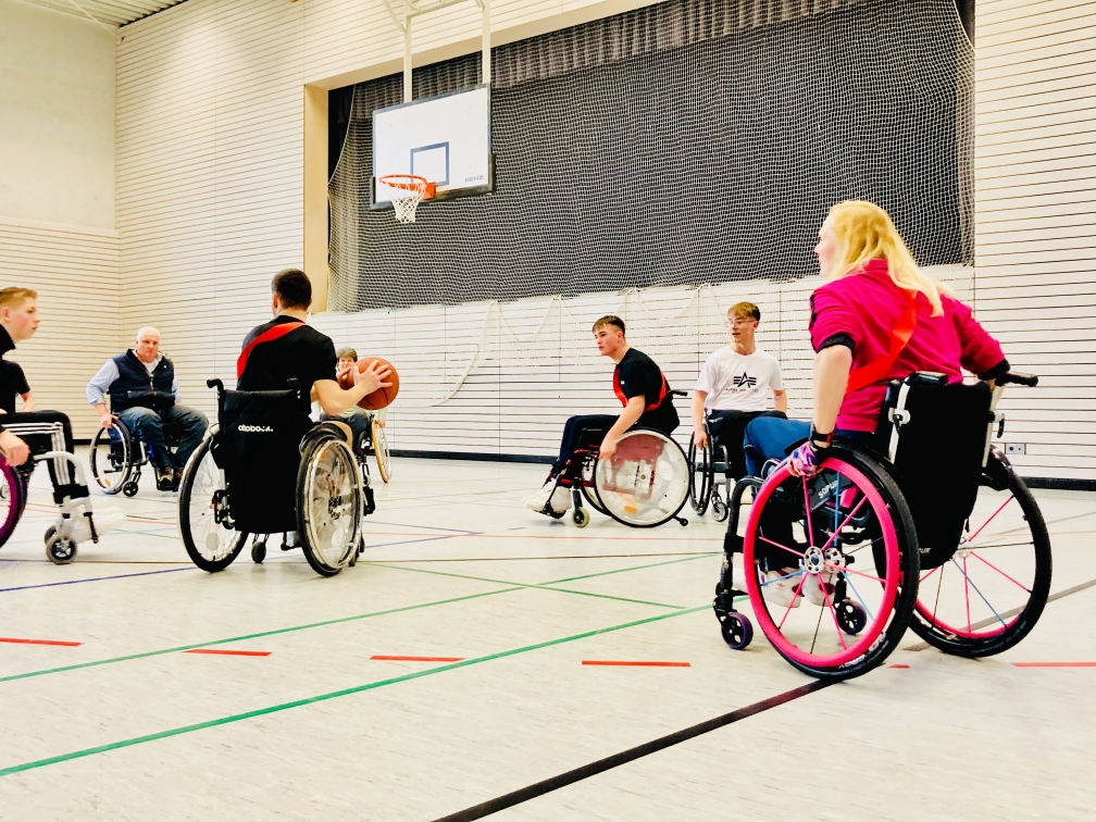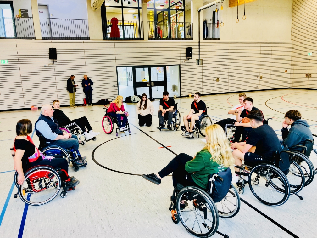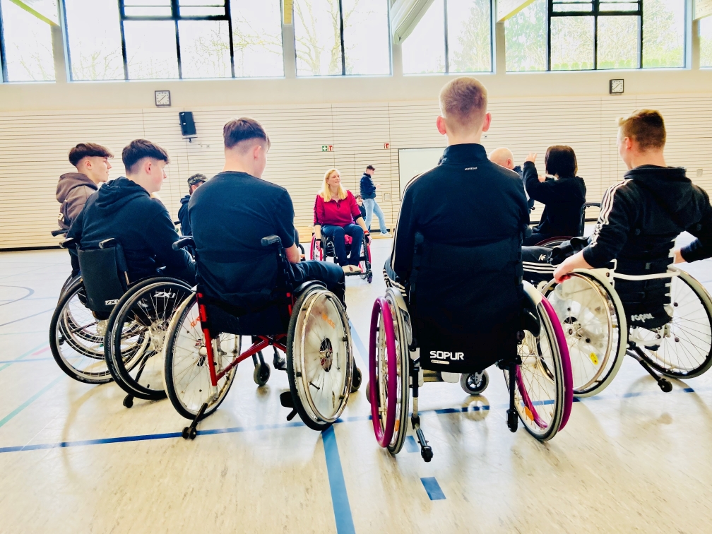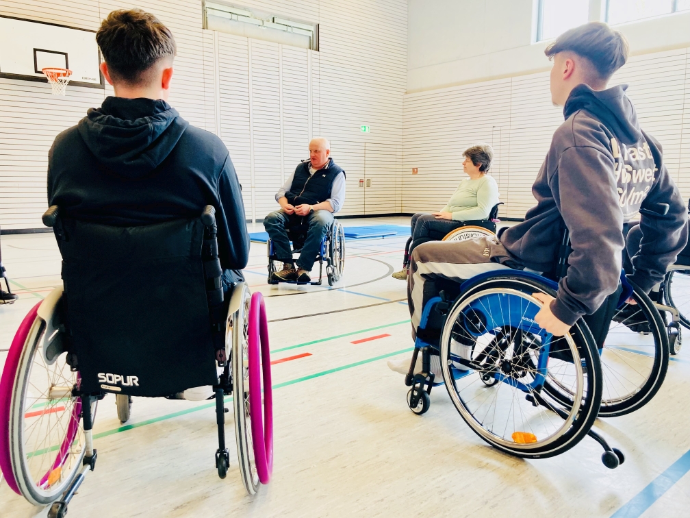 Heute, am 20.04.2023 waren Mitglieder des Rollstuhlsportverein-Heilbronn e.V. in Wüstenrot an der Georg-Kropp-Schule aktiv. 13 angemeldete Schüler der 10. Klasse wollten erleben wie es sich anfühlt, im Rollstuhl zu sitzen und darin auch noch sportlich aktiv zu sein. Mitglieder des RSV-e.V. (Andreas, Ute und Sieglind) unterrichteten die wissbegierigen Schüler, wie sie mit dem Rollstuhl umgehen müssen. Fahren, Kippen, einen Randstein überwinden usw. In kurzer Zeit hatten die Schüler die Grundregeln intus und man konnte zum Sport übergehen.