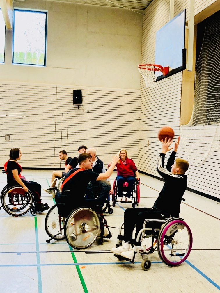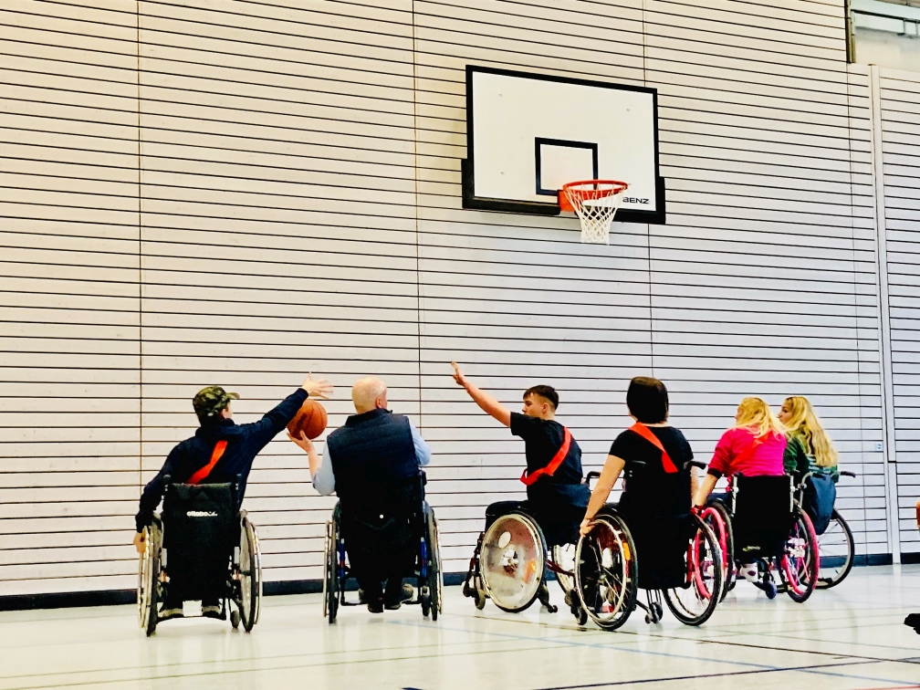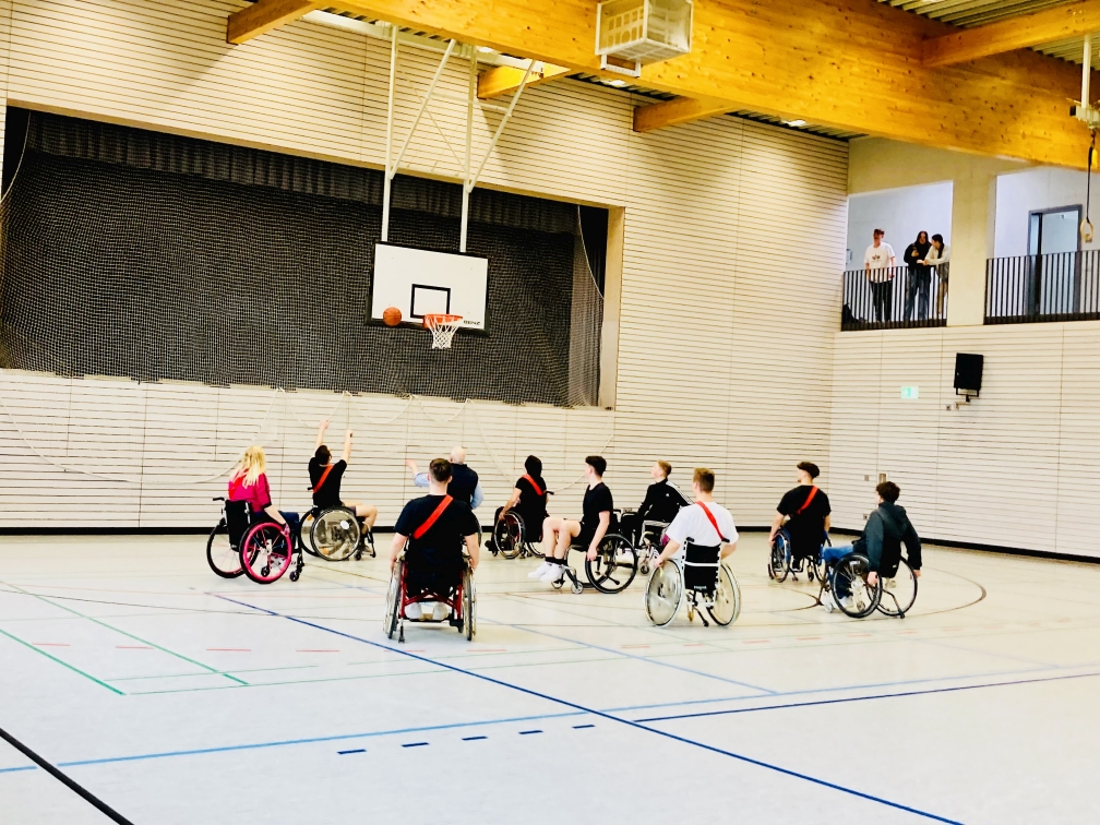 Nach verschiedenen Bewegungsspielen kam der Toptagespunkt: Rollstuhlbasketball! Spontan haben sich weitere Schüler freiwillig in einen Rolli gesetzt und mitgekämpft. Das Basketballspiel ging 6 : 6 aus. Am Ende fand eine Fragerunde statt, in der die Schüler Fragen an die echten Rollifahrer stellen konnten.