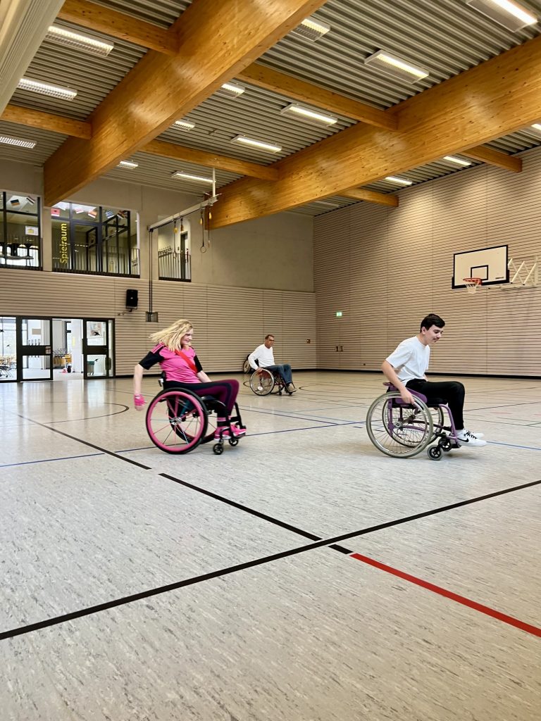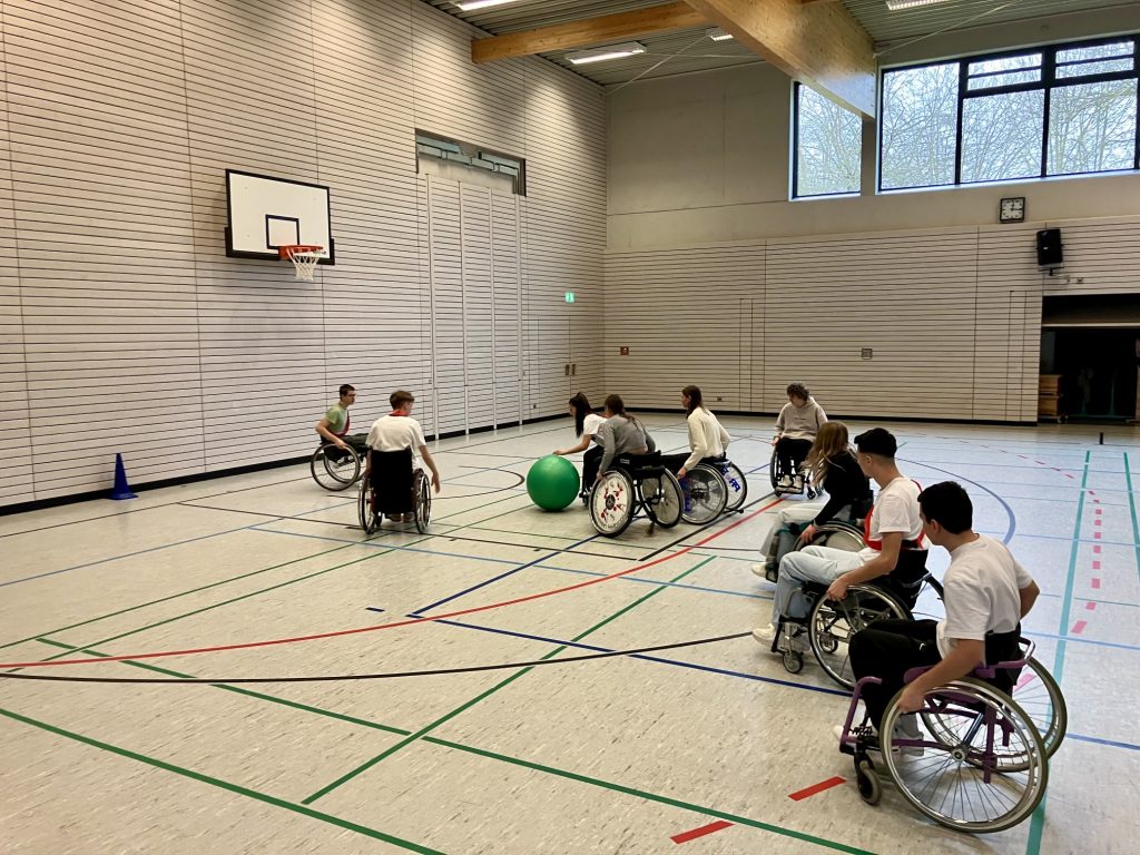 Das Highlight der Veranstaltung war der Rollstuhlsport. Es wurde Rollstuhlbasketball und Wheel-Soccer gespielt. Die anfängliche Zurückhaltung konnte schnell abgelegt werden und der Umgang mit dem Rollstuhl wurde immer intuitiver. Beim Wheel-Soccer wird mit einem Pezziball gespielt, der lediglich mit der Hand gerollt und auch mit dem Rollstuhl angetippt werden darf. Am Ende verließen wir ausgepowert und um einige Erfahrungen reicher, die Sporthalle.