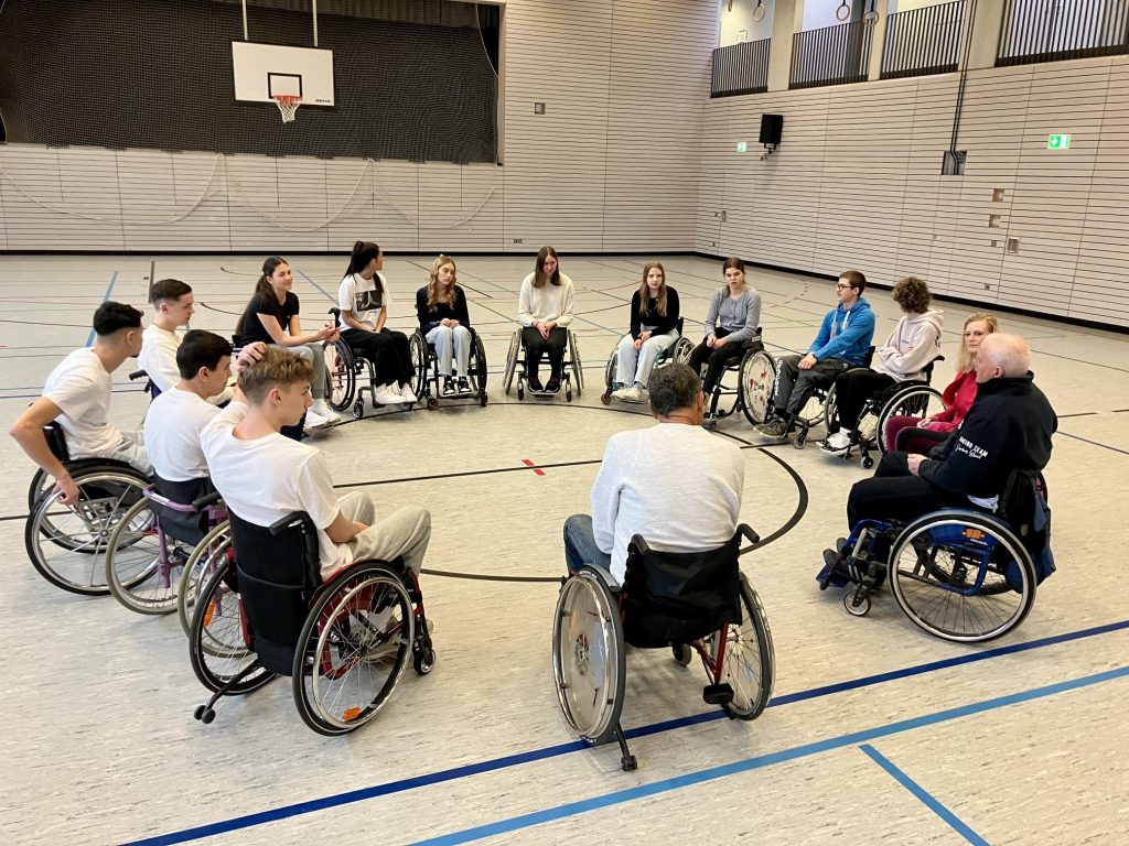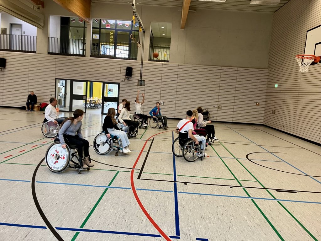 Zunächst mussten sich die SchülerInnen an das Handling des Rollstuhls gewöhnen. So wurde ein Parcours „durchfahren“. Hier lag der Fokus auf das Lenken des Rollstuhls, das Überwinden von Hindernissen und das Beschleunigen mit dem Rollstuhl. Dass das Überwinden einer einfachen Turnmatte (mit einem Bordstein zu vergleichen) so herausfordernd sein kann, hatten alle etwas unterschätzt. In einer kleinen Gesprächsrunde konnten sowohl Fragen zum Umgang mit dem Rollstuhl im Alltag oder im Sport geklärt werden als auch von den eigenen, gesammelten Erfahrungen berichtet werden. An dieser Stelle ein großes Danke an Ute und Andreas für ihre Offenheit.