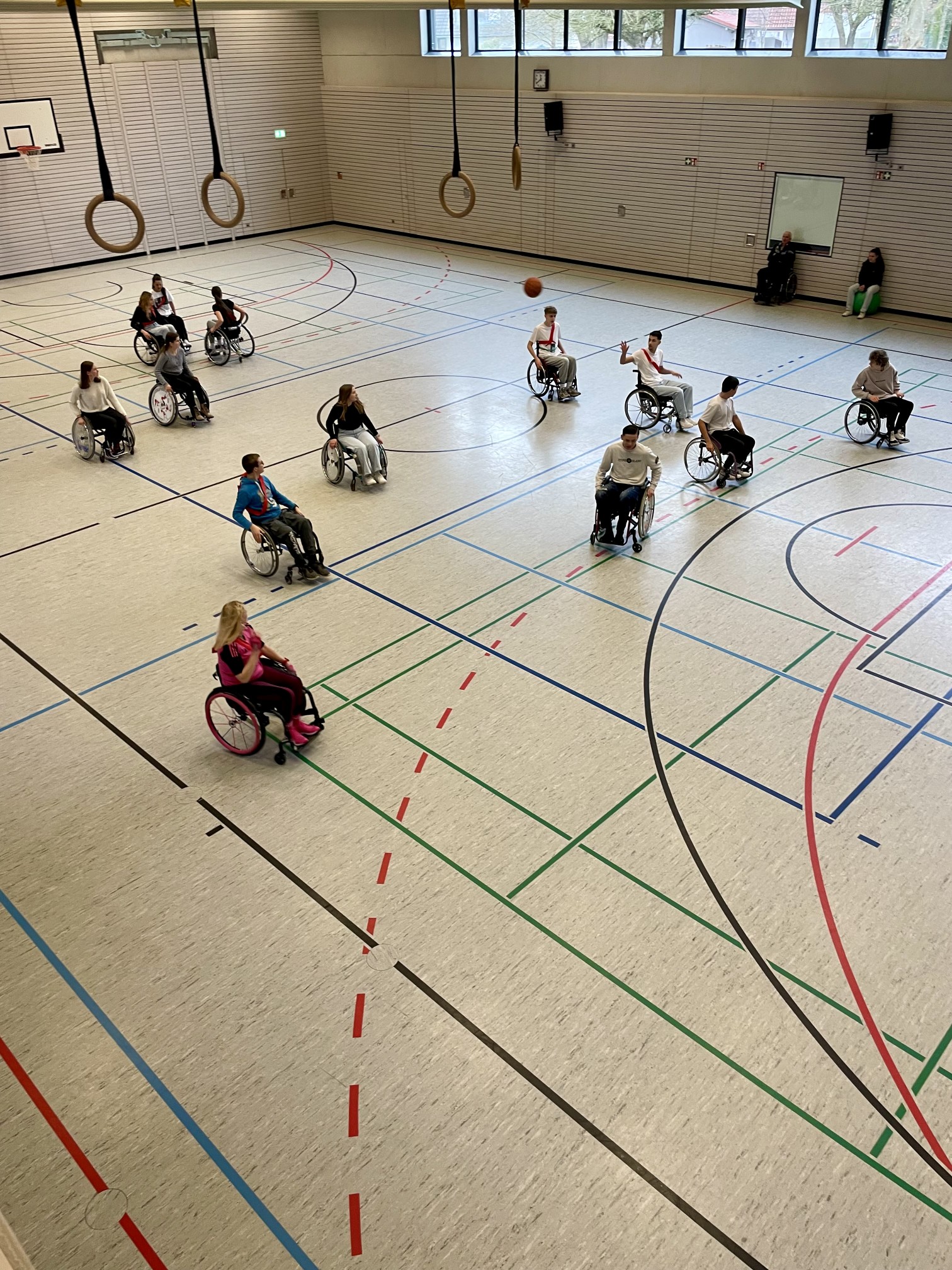 Das Highlight der Veranstaltung war der Rollstuhlsport. Es wurde Rollstuhlbasketball und Wheel-Soccer gespielt. Die anfängliche Zurückhaltung konnte schnell abgelegt werden und der Umgang mit dem Rollstuhl wurde immer intuitiver. Beim Wheel-Soccer wird mit einem Pezziball gespielt, der lediglich mit der Hand gerollt und auch mit dem Rollstuhl angetippt werden darf. Am Ende verließen wir ausgepowert und um einige Erfahrungen reicher, die Sporthalle.