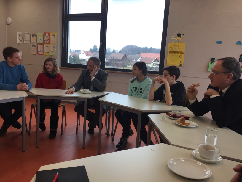 Insbesondere die Lernbegleitung über Logbücher gefällt den Schülerinnen und Schüler sehr gut. Schulleiter Wetter berichtete, auch die Motivation der Lehrkräfte sei sehr hoch. Die offene Diskussion mit den Schülerinnen und Schülern und deren große Fähigkeit, sich zu artikulieren, hat Stoch und Gall besonders beeindruckt.