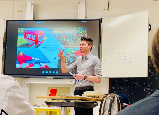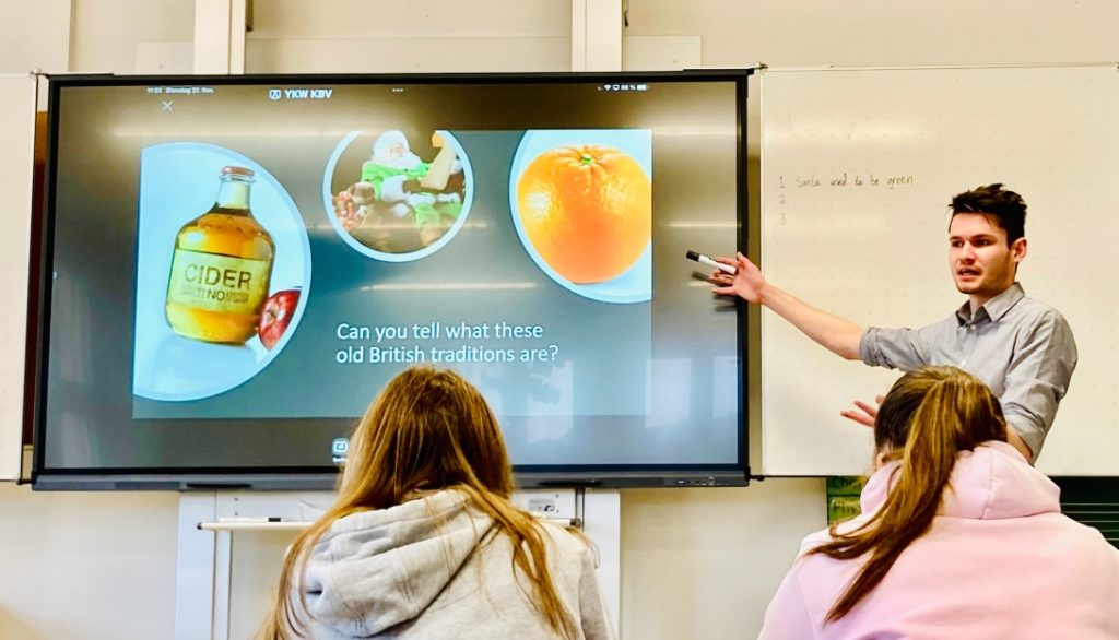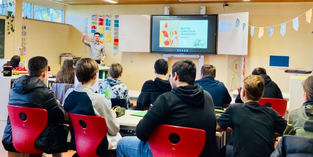 Am Dienstag, den 22. November 2022 durften wir Joe aus Bournemouth in Begleitung eines Vertreters der Organisation EF bei uns willkommen heißen. Er brachte viele Informationen Rund um das Thema „Christmas Traditions in Great Britain“ mit. Allein die Tatsache, dass es sich um einen Englischlehrer handelte, der tatsächlich kein Deutsch spricht, begeisterte die Schülerinnen und Schüler der Klassenstufe 8 und 10 ungemein. Darüber hinaus lockerte er die Stimmung gekonnt durch humorvolle Äußerungen wie „We set almost everything on fire on Christmas“ auf. Dies bezog sich vorwiegend auf den flambierten „Christmas Pudding“ und die „Letters to Santa“, die im Ofen verbrannt werden.