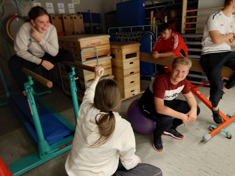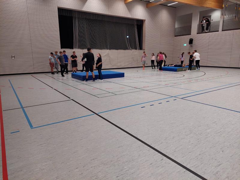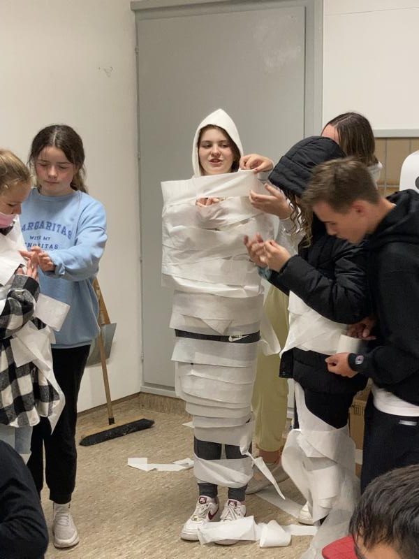 Danach haben wir gemeinsam ein paar Halloweenspiele gespielt. Zum Beispiel mussten wir ein paar Mitschüler mit Klopapier einrollen, damit man wie eine Mumie aussieht. Das war vielleicht witzig. Danach sind wir alle um 22.00 Uhr in die Sporthalle. Gemeinsam haben wir Völkerball, Fußball, Paintball und zuletzt Mattenrutschen gespielt. Ungefähr um 0:30 Uhr sind wir alle wieder in unsere Klassenzimmer zurück und haben unsere Betten bzw. Luftmatratzen und Schlafsäcke hergerichtet und haben uns bettfertig gemacht. Nach dem Sport haben wir noch Snacks gegessen. Um 2:30 Uhr mussten wir alle leise sein, da manche schlafen wollten. Als wir alle um 6:30 Uhr wieder wach waren, haben wir alle gemeinsam gefrühstückt. Es gab frische Weckle vom Bäcker Trunk mit Marmelade, Nutella, Wurst, Käse und noch die restlichen Muffins vom gestrigen Abend. Da die meisten von uns die ganze Nacht durchgemacht haben, waren dementsprechend auch viele müde und deshalb haben wir den ganzen Unterricht Filme geschaut oder einfach nur gechillt.