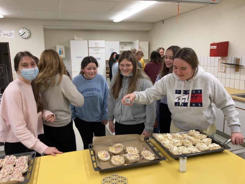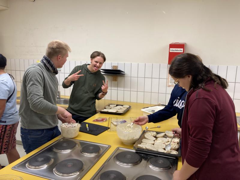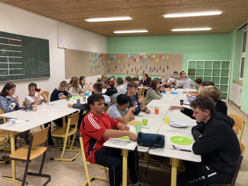 Von Donnerstag, den 22.10.2021 auf Freitag, den 23.10.2021 haben wir (Klasse 9a und 9b gemeinsam mit Frau Kappe, Frau Holderbach und Herr Bodenmüller) zusammen in der Schule übernachtet. Abends um 19.00 Uhr haben uns unsere Eltern in die Schule gefahren und dort haben wir uns alle gemeinsam in unserem Klassenzimmer im Altbau der Georg-Kropp-Schule versammelt. Als wir alle da waren, haben wir zum Abendessen Pizzaweckle gemacht – da war kurzeitig an ganz schönes Chaos in der Küche. Als das Essen fertig war, haben wir uns in unserem Lernatelier getroffen und unsere Pizzaweckle zusammen gegessen.