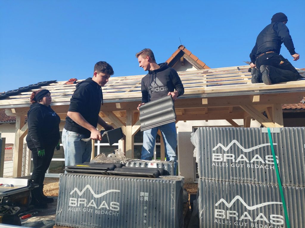Am Freitag deckte die Firma HAMMER mit Unterstützung der Zehntklässler, Techniklehrer Stefan Bodenmüller und der Lehramtsstudentin Beatrix Weber das Dach.
