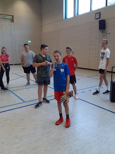 Unter tosendem Applaus liefen am Dienstag 23.7.2019 die Mannschaften der Lerngruppen 7a,7b, 8a,8b,8c und das Lehrerteam in die GKS-Halle ein. Nachdem die Turnierleitung (Jean-Pierre, Luka und Leon K.) die Spieler und Zuschauer begrüßten, begannen die Spiele. Nach zahlreichen Toren, Schwalben, Fouls, Elfmeterschießen, Zujubeln und Einklatschen stand der Sieger Lerngruppe 8C fest. Wobei der Titel „Sieger des Outfits und der Herzen“ bereits nach den ersten Minuten ihres Einsatzes an die Lehrer vergeben wurde. 😊