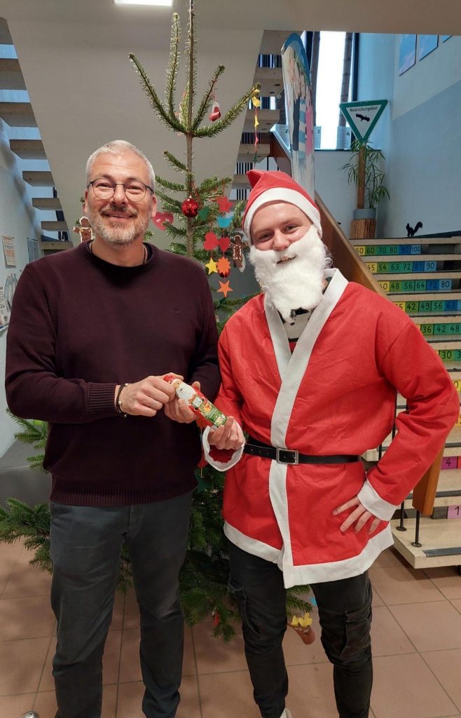 Seit Wochen waren die Schülersprecher fleißige Mitarbeiter vom Nikolaus. In den Pausen wurden Grußkarten verkauft, welche mit persönlichen Worten oder weihnachtlichen Wünschen gestaltet werden konnten. Diese Grußkarten wurden dann an Schokolollis gebunden und für die jeweiligen Klassen gerichtet. So konnte der Nikolaus schließlich am 6.12.22 ca. 300 Nikoläuse an strahlende Kinder verteilen, die ihn bereits sehnsüchtig mit Liedern und Gedichten erwarteten.