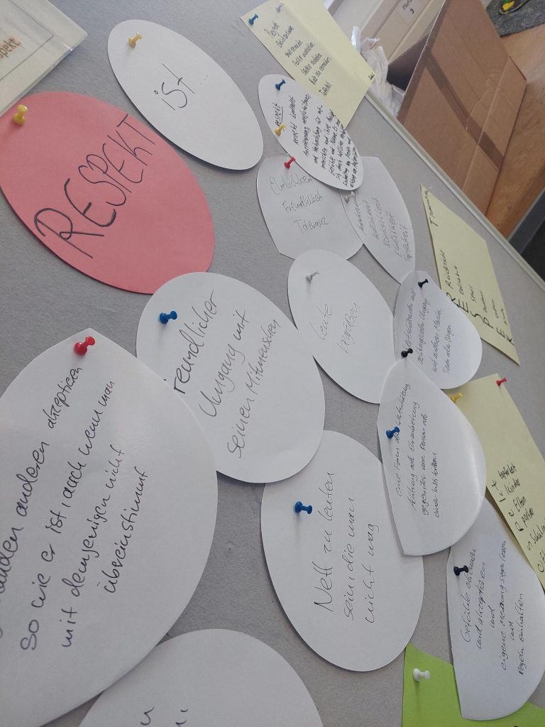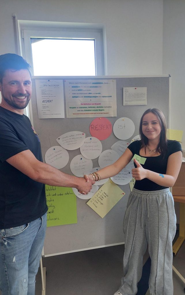 Der Tag begann mit einer herzlichen Begrüßung und einem Austausch innerhalb der Gruppe, um uns besser kennenzulernen. In einer Stimmungsrunde wurde schnell deutlich, dass Respekt ein wichtiger Bestandteil des Zusammenlebens ist. Unsere Konrektorin Frau Bayer führte uns dann nach ihrer Begrüßung in das Thema Respekt ein, betonte die Bedeutung von Wertschätzung, Rücksichtnahme und Anerkennung. Dazu wurde gemeinsam das Wort „Respekt“ in großen Holzbuchstaben gestaltet und mit passenden Wörtern beschriftet. Nach einer Pause setzten wir die Gespräche fort und planten zukünftige Aktivitäten der SMV. „Frau Holderbach und Herr Bodenmüller, unsere Vertrauenslehrer, waren an diesem Tag immer da und begleiteten uns bei diesem schwierigen und interessanten Thema.“; schwärmt Elina (7a). „Es war eine inspirierende Veranstaltung, die uns daran erinnerte, wie wichtig es ist, respektvoll miteinander umzugehen.“, ergänzt Schülerin Noemi (10b).