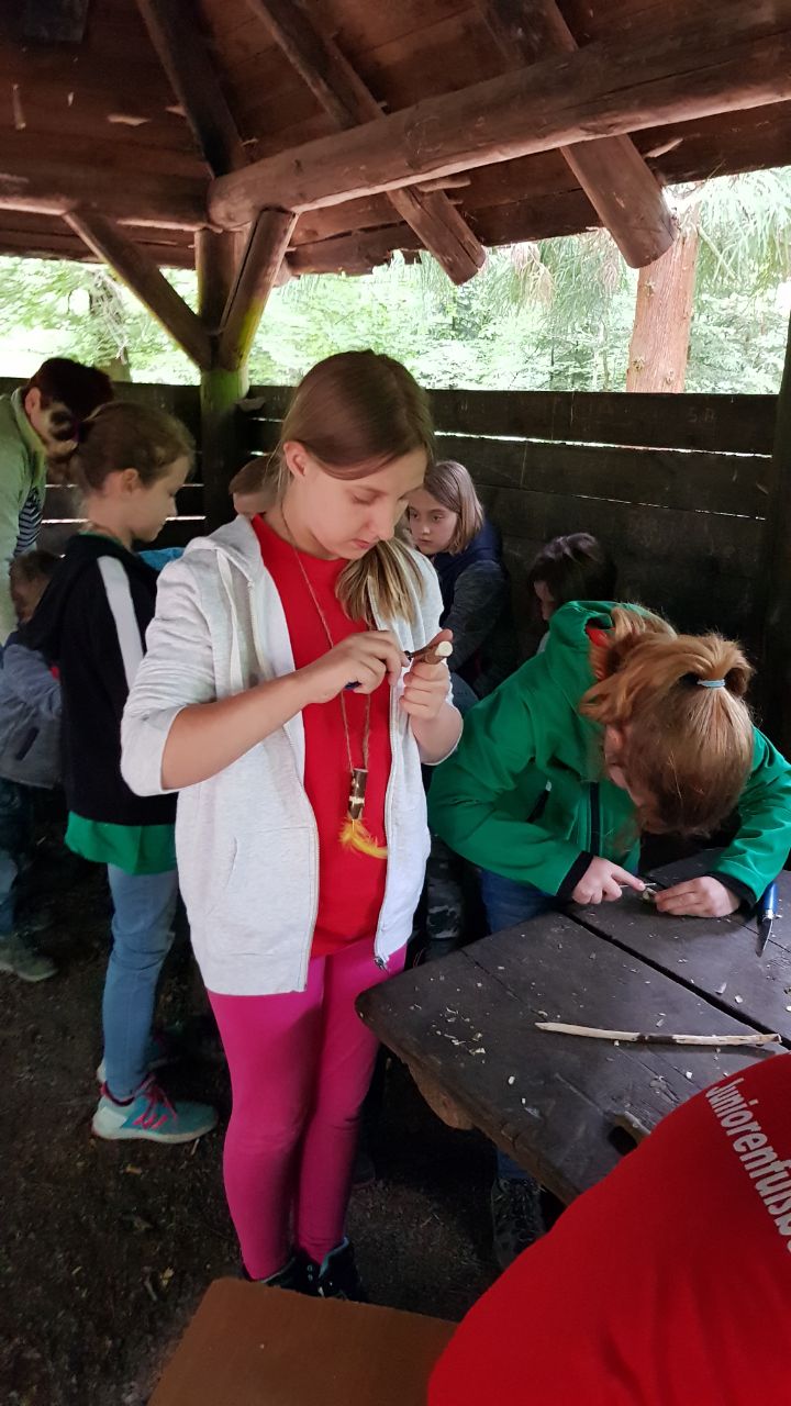 Schon im Vorfeld hatten die Schüler mit viel Begeisterung das Schnitzen und Sägen in der Schule geübt und dabei individuelle Kettenanhänger aus Ästen hergestellt.