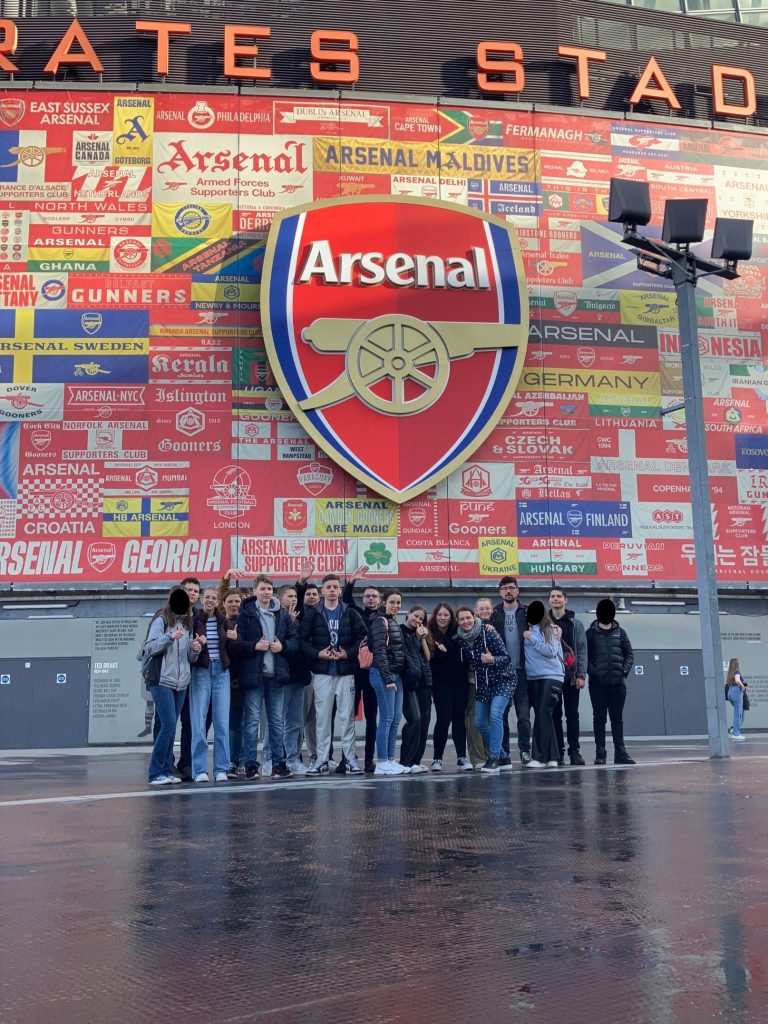 Am Mittwoch kamen alle Fußballbegeisterten auf ihre Kosten, als wir zum Emirates Stadium, der Heimat des FC Arsenal, fuhren. Die U-Bahn-Station „Arsenal“ ist übrigens die einzige in ganz England, die nach einem Fußballverein benannt wurde. Jeder von uns erhielt einen Audioguide und konnte das Stadion in seinem eigenen Tempo erkunden, angefangen von der VIP-Lounge über die Sitztribüne bis hin zu den Gäste- und den wesentlich luxuriösen Heimkabinen der „Gunners“. Dort konnten wir die Trikots der aktuellen Stammbesetzung bewundern. Ein Foto mit dem Trikot des deutschen Spielers Kai Havertz durfte natürlich nicht fehlen. Besonders beeindruckend war der Gang durch den Spielertunnel ins Stadion, der uns einen kleinen Eindruck davon verlieh, wie es sich anfühlen muss, den „heiligen“ Rasen unter dem Jubel der Fans zu betreten. Einige SchülerInnen hatten sogar die Gelegenheit, ein Foto mit dem Maskottchen, dem „Gunnersaurus“, zu ergattern. Anschließend führte uns unser Weg mit der Tube zum Camden Market, wo sich die SchülerInnen in Kleingruppen durch die bunten Flohmärkte und den Street Food Market bewegen durften. Hier bekamen wir erneut einen Eindruck davon, was London so einzigartig macht, und ließen dieses einzigartige Flair auf uns wirken. Den Abschluss des Tages bildete ein Besuch der Baker Street 221b, wo wir ein Foto mit der Statue des berühmten Detektivs Sherlock Holmes machten.