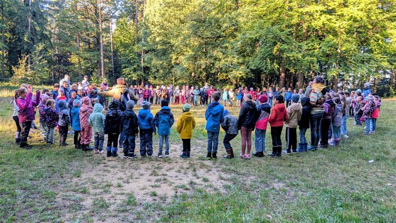 Der Auftakt des Waldtages begann mit einem gemeinsamen Vesper am Grillplatz, bei dem sich die Kinder für die bevorstehenden Aktivitäten stärken konnten. Danach versammelten sich alle auf der großen Lichtung. Dort begrüßte die Klasse 4b die Teilnehmenden und erklärte die wichtigsten Waldregeln.