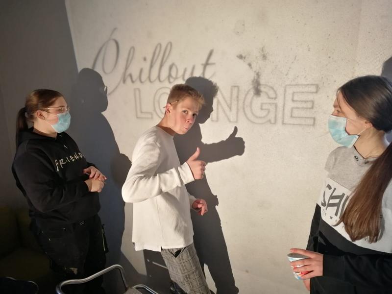 Dank zahlreicher Helfer, die sich in den letzten drei Wochen mittwochs nachmittags freiwillig zum Einräumen, Ausbessern und Verschönern der Chillout-Lounge getroffen haben, konnte der Raum am Freitag, 17.12.2021 von Rektor Peter Wetter eingeweiht und eröffnet werden. Viele strahlende Augen konnten es kaum fassen, in welch einem Glanz die ehemalige Abstellkammer nun erstrahlt. Dank einiger Spenden konnte der Raum bereits mit Sofas, einer Mikrowelle, einem Toaster, einer Kaffeemaschine und einem Wasserkocher ausgestattet werden. Sogar Besteck und Geschirr ist vorhanden, damit man dort nicht nur chillen, sondern auch seine Mittagessen mehr oder weniger an der von Herrn Wetter und seinen ehemaligen Schülern selbst gebauten „Bar“ zubereiten kann.