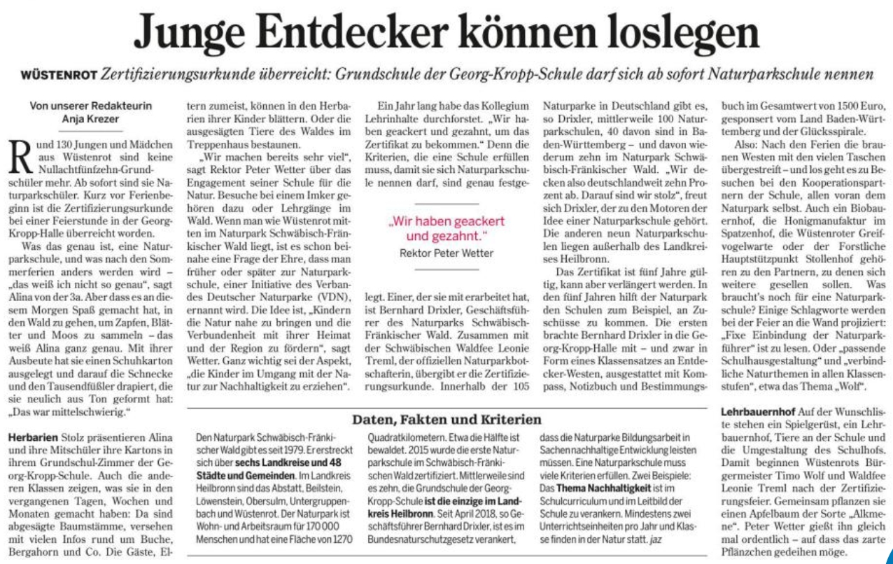 Zertifizierungsfeier Naturparkschule von admin | Juli 29, 2019 | Georg-Kropp-Schule Heilbronner Stimme, Samstag, 27.07.2019